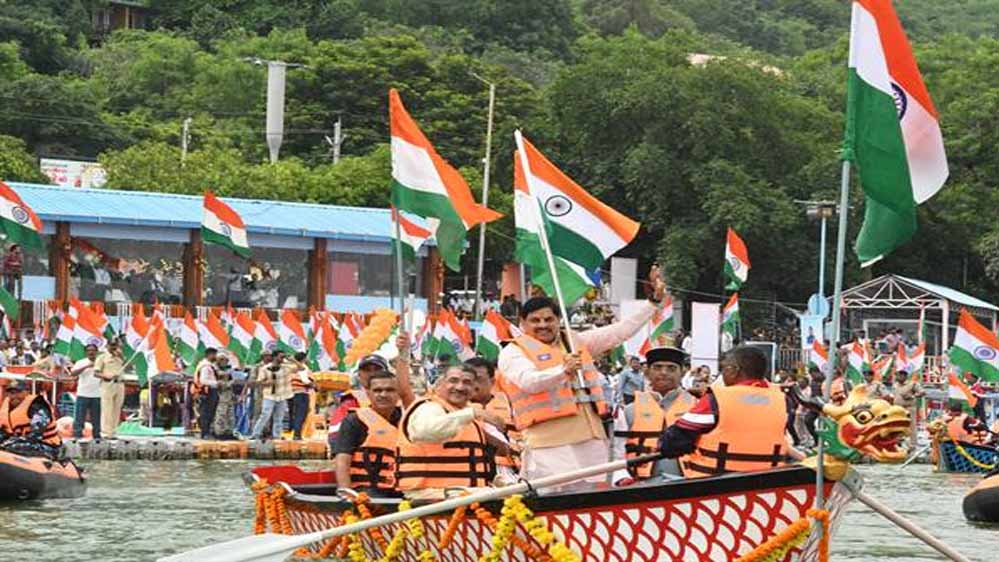 मुख्यमंत्री डॉ. यादव प्रदेश में जारी हर घर तिरंगा अभियान के अंतर्गत भोपाल के बड़े तालाब के बोट क्लब से निकाली गई जल तिरंगा यात्रा का शुभारंभ कर संबोधित कर रहे थे। उन्होंने झंडी दिखाकर जल तिरंगा यात्रा की शुरुआत की। मुख्यमंत्री डॉ. यादव ने बड़ी संख्या में तिरंगे गुब्बारे आकाश में छोड़े। एशियाई और ओलंपिक गेम्स में उपयोग में आने वाली बोट्स में सवार वॉटर स्पोर्ट्स खिलाड़ी अनुशासन और गरिमा के साथ तिरंगा लेकर बड़े तालाब में आगे बढ़े, क्षेत्र का नभ-जल और धरा तिरंगामय हो गया। देशभक्ति, एकता और समर्पण की भावना को और सशक्त करते इस अनोखे, रोमांचक आयोजन में बड़ी संख्या में वॉटर स्पोर्ट्स खिलाड़ी, विद्यार्थी और राजधानीवासी शामिल हुए। इस अवसर पर खेल एवं युवा कल्याण मंत्री विश्वास सारंग, पिछड़ा वर्ग एवं अल्पसंख्यक कल्याण राज्यमंत्री (स्वतंत्र प्रभार) श्रीमती कृष्णा गौर, प्रदेशाध्यक्ष हेमंत खंडेलवाल, भोपाल महापौर श्रीमती मालती राय और रविन्द्र यति उपस्थित थे।