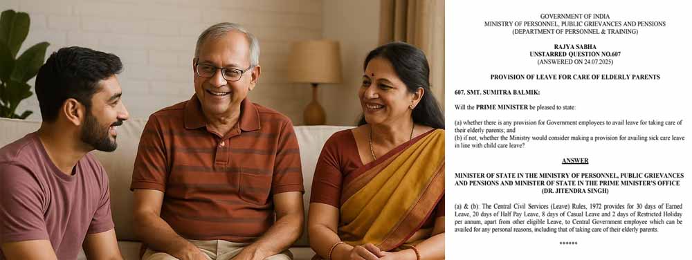 केंद्रीय मंत्री जितेन्द्र सिंह ने राज्यसभा में एक सवाल के जवाब में बताया कि केंद्रीय सिविल सेवा (छुट्टी) नियम, 1972 में अन्य पात्र छुट्टियों के अलावा, केंद्र सरकार के कर्मचारियों को प्रति वर्ष 30 दिन की अर्जित छुट्टी, 20 दिन की आधे वेतन की छुट्टी, 8 दिन की आकस्मिक छुट्टी और 2 दिन की प्रतिबंधित छुट्टी का प्रावधान है। इसका लाभ वे अपने बुजुर्ग माता-पिता की देखभाल सहित किसी भी व्यक्तिगत कारणों से उठा सकते हैं।