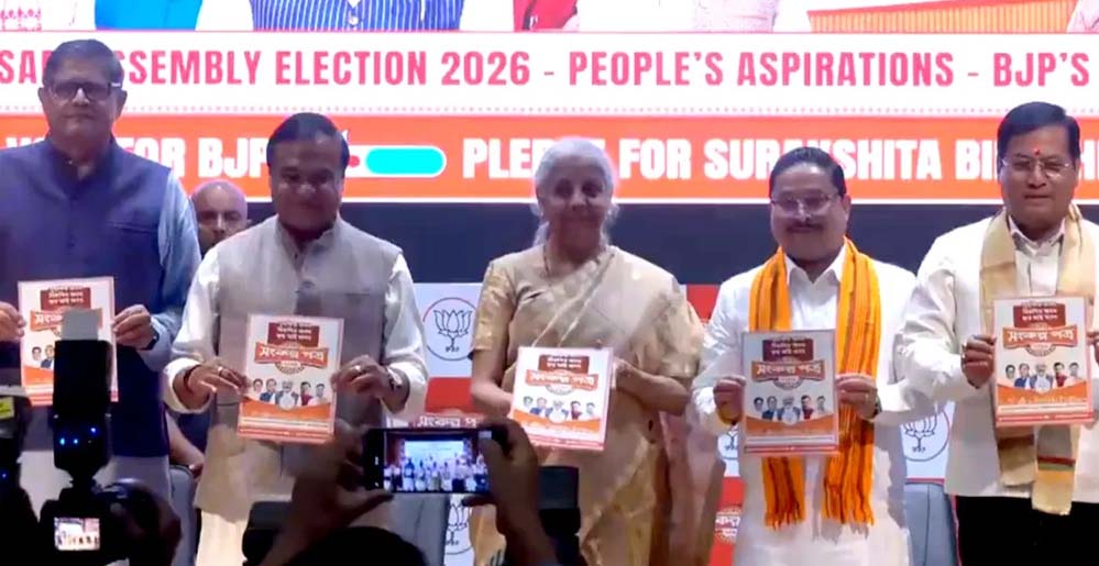 गुवाहाटी स्थित असम बीजेपी के कार्यालय में आयोजित कार्यक्रम में जारी घोषणापत्र को पार्टी ने संकल्प पत्र नाम दिया है. मुख्यमंत्री हिमंत बिस्वा सरमा और असम बीजेपी के अध्यक्ष दिलीप सैकिया के साथ केंद्र की मोदी सरकार में वित्त मंत्री निर्मला सीतारमण ने यह घोषणापत्र जारी किया. बीजेपी ने असम में समान नागरिक संहिता (यूसीसी) लागू करने, दो लाख नौकरियां देने का भी वादा किया है।
