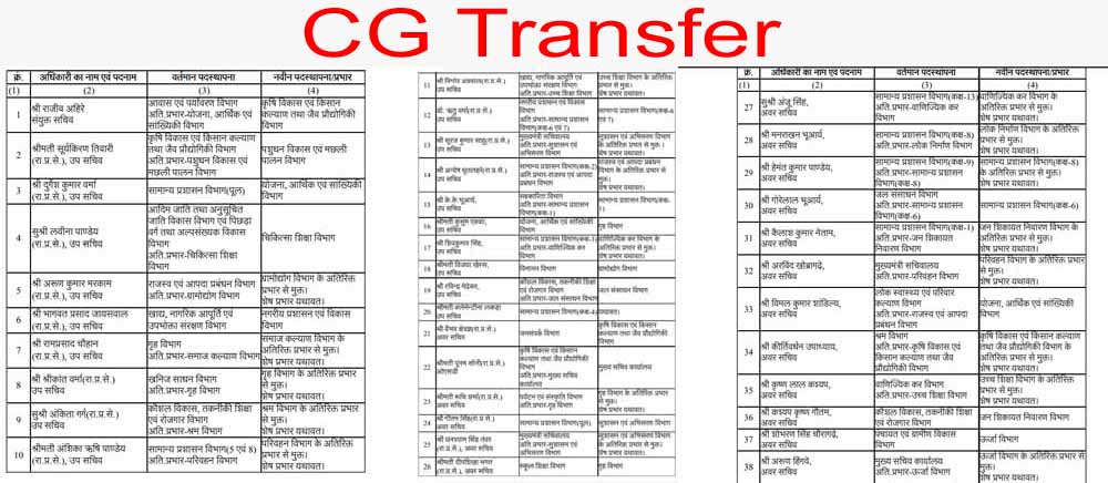 छत्तीसगढ़ में एक बार फिर बड़ा प्रशासनिक फेरबदल हुआ है। राज्य सरकार ने राज्य प्रशासनिक सेवा के एक साथ अधिकारियों का एक साथ तबादला किया है। इस संबंध में सामान्य प्रशासन विभाग ने आदेश जारी किया है। जारी आदेश में कुल 38 अधिकारियों का नाम शामिल है।