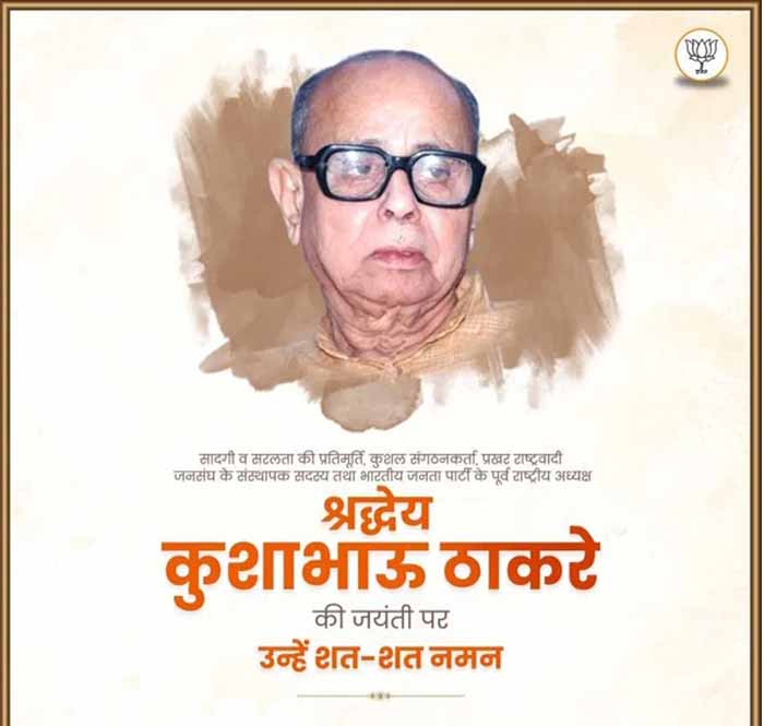 मध्यप्रदेश की राजधानी भोपाल में आज भारतीय जनता पार्टी (बीजेपी) के पितृ पुरुष कुशाभाऊ ठाकरे की जयंती मनाई गई। मुख्यमंत्री डॉ मोहन यादव कुशाभाऊ ठाकरे कन्वेंशन सेंटर में पुष्पांजलि अर्पित की। बीजेपी प्रदेश अध्यक्ष हेमंत खंडेलवाल के साथ पार्टी कार्यकर्ताओं ने पुष्पांजलि अर्पित कर उका भावभीना स्मरण किया।