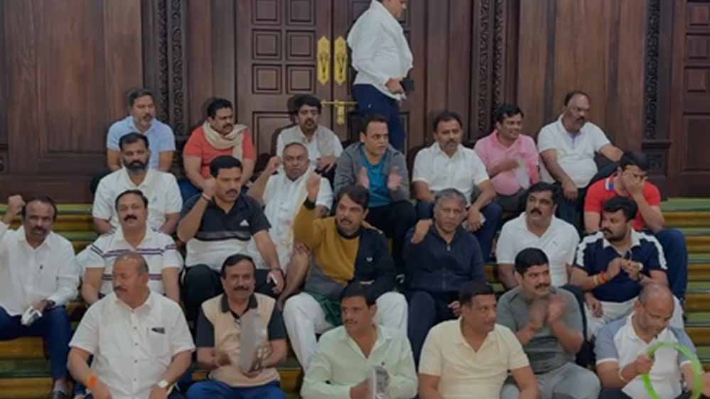 भारतीय जनता पार्टी (भाजपा) और जनता दल-सेक्युलर (जेडीएस) के विधायकों ने कथित शराब घोटाले को लेकर आबकारी मंत्री आरबी थिम्मापुर के खिलाफ प्रदर्शन करते हुए कर्नाटक विधानसभा में रात गुजारी। बुधवार सुबह भी भाजपा-जेडीएस विधायकों का प्रदर्शन जारी रहा। कर्नाटक भाजपा के अध्यक्ष व विधायक बीवाई विजयेंद्र और विपक्ष के नेता आर. अशोक समेत कई विधायक विधानसभा परिसर में मॉर्निंग वॉक करते हुए नजर आए। बाद में सभी विधायक एक जगह इकट्ठा हुए, चाय पी और आगे की कार्रवाई पर चर्चा की। कुछ देर बाद विरोध प्रदर्शन फिर से शुरू हुआ, जिसमें भाजपा और जेडीएस के विधायक विधानसभा के प्रवेश द्वार की सीढ़ियों पर बैठ गए और एक्साइज मंत्री के इस्तीफे की मांग करते हुए नारे लगाए। उन्होंने गाने भी गाए और 'भारत माता की जय' के नारे लगाए।