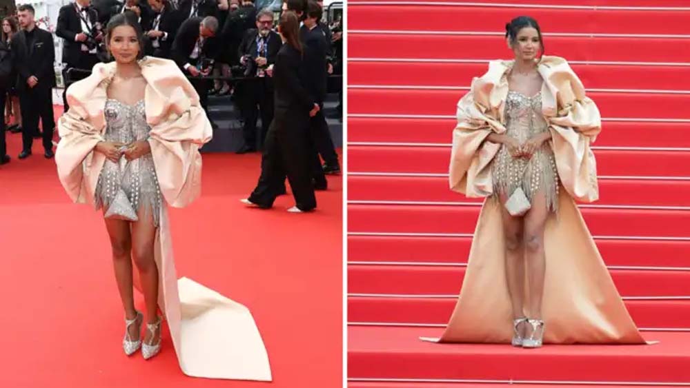 कान्स में अपनी पहली अपीयरेंस के लिए नैंसी ग्रीन फ्लोरल गाउन पहनकर आईं, तो दूसरे दिन हसीना ने मिनी ड्रेस में जलवा बिखेरा। क्रिस्टल और पर्ल एम्बेलिशमेंट से सजी इस ड्रेस का कलर हसीना की मां का पसंदीदा है। इसलिए उन्होंने इस सिल्वर-बेज मिक्स्ड ह्यूड ड्रेस को सिलेक्ट किया। जिसके साथ वह कान्स के नए ड्रेस रूल्स के हिसाब से लंबी ट्रेन नहीं पहन सकती थीं, तो उन्होंने अपना जुगाड़ु दिमाग लगाकर उसे पफी ओवरकोट विद ट्रेल लुक दे दिया।