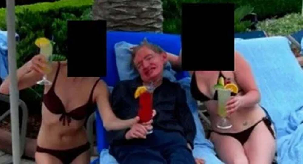 जब से एपस्टीन फाइल जारी हुई हैं, तब से अमेरिका समेत दुनियाभर में हड़कंप मचा हुआ है। कई नामी-गिरामी लोगों के नाम सामने आ चुके हैं। अब स्टीफन हॉकिंग की एक तस्वीर सामने आई है, जिसने हंगामा खड़ा कर दिया है। जेफरी एपस्टीन की फाइलों से सामने आई इस फोटो में स्टीफन हॉकिंग दो बिकिनी पहनी महिलाओं के बीच में हैं। हॉकिंग के बगल में लेटीं दोनों महिलाओं की पहचान उजागर नहीं हुई है। एक महिला हॉकिंग के दाएं ओर है, तो दूसरी बाएं ओर लेटी है। तीनों के हाथों में पेय पदार्थ है और स्टीफन हॉकिंग वाला ग्लास उनके अलावा महिला ने भी पकड़ रखा है। दोनो महिलाओं के चेहरे को काले रंग से ढक दिया गया है, ताकि पहचान सामने न आए। दोनों ने ब्लैक कलर की बिकिनी पहन रखी है।