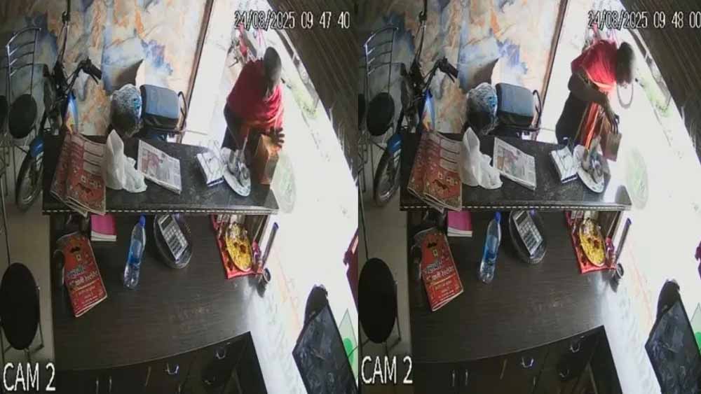 छत्तीसगढ़ के जगदलपुर शहर में चोर ने पुलिस थाने के सामने ही दिन-दहाड़े चोरी की वारदात को अंजाम दिया है. कोतवाली थाने के ठीक सामने स्थित महावीर थाली रेस्टोरेंट में रखी गई गौसेवा दान पेटी को एक बुजुर्ग चोर दिनदहाड़े लेकर फरार हो गया. इस घटना का सीसीटीवी फुटेज भी सामने आया है, जिसमें साफ दिखाई दे रहा है कि चोर पहले काउंटर पर रखी सौंफ खाता है और फिर मौके का फायदा उठाकर बेहद आराम से दान पेटी लेकर भीड़ में गायब हो जाता है.